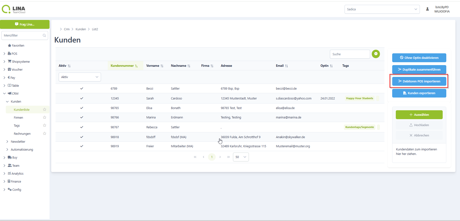 Klicke also, nach Auswahl der Datei, auf Hochladen um die CSV Datei mit den Kundendaten in LINA hochzuladen oder auf Abbrechen um den Vorgang zu beenden.
