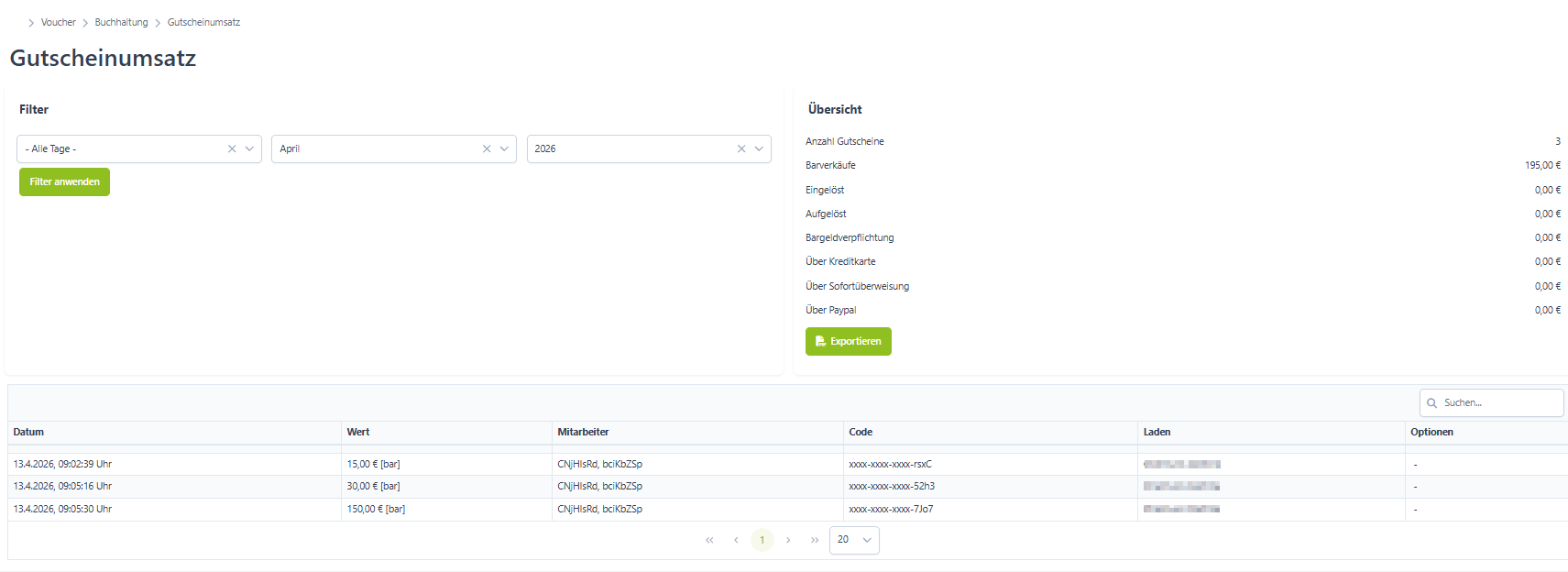 Im unteren Bereich der Seite werden dadurch die Gutscheine einzeln aufgelistet und nach Datum, Wert, Mitarbeiter, Code und Optionen aufgeschlüsselt.