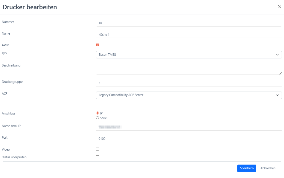 | Anschluss | Hier kannst du zwischen IP und Seriell wählen. IP: Wenn du IP auswählst, gib im Feld Name bzw. IP die IP-Adresse des Druckers ein. Im Feld Port muss 9100 bei Standarddruckern eintragen. Hierbei muss zuvor im Netzwerk geprüft werden, dass die eingestellte IP-Adresse noch nicht verwendet wird. Seriell: Wird seriell ausgewählt, muss im Feld COM-Port der entsprechende Port ausgewählt werden und im Feld Baudrate die entsprechende Baudrate eingestellt werden. Im Feld Modus, muss der entsprechende Modus eingestellt werden. |
