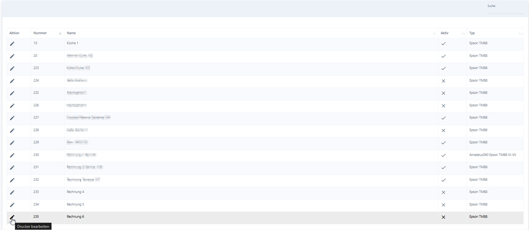Ein Drucker kann nicht gelöscht werden. Du kannst ihn aber auf inaktiv stellen. Klicke dazu auf den Bearbeitungsstift vor dem gewünschten Drucker, entferne den Haken bei Aktiv und klicke anschließend auf Speichern. Der Drucker wird dir nun in der Übersicht, in der Tabellenspalte Aktiv, mit einem Kreuz angezeigt.