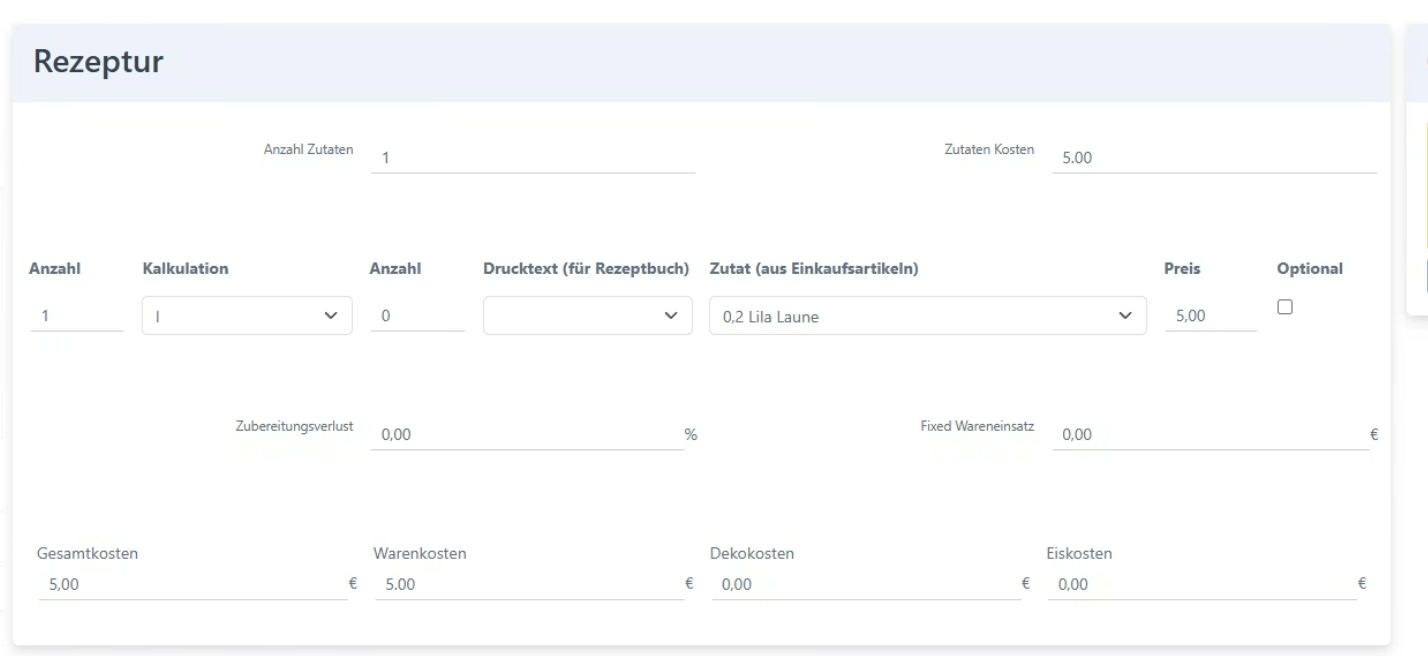 | Eiskosten: | Wird eine Zutat aus der Rubrik Eis (Modul Buy) gewählt, so wird der Preis als Eiskosten gerechnet und nicht auf die Gesamtkosten |