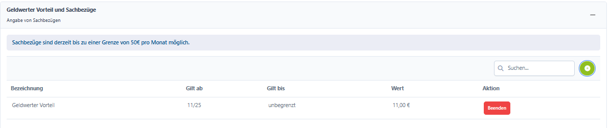 Möchtest du einen Geldwerten Vorteil oder einen Sachbezug nicht mehr auszahlen kannst du diesen unter Aktion mit dem Button "Beenden" wieder entziehen.