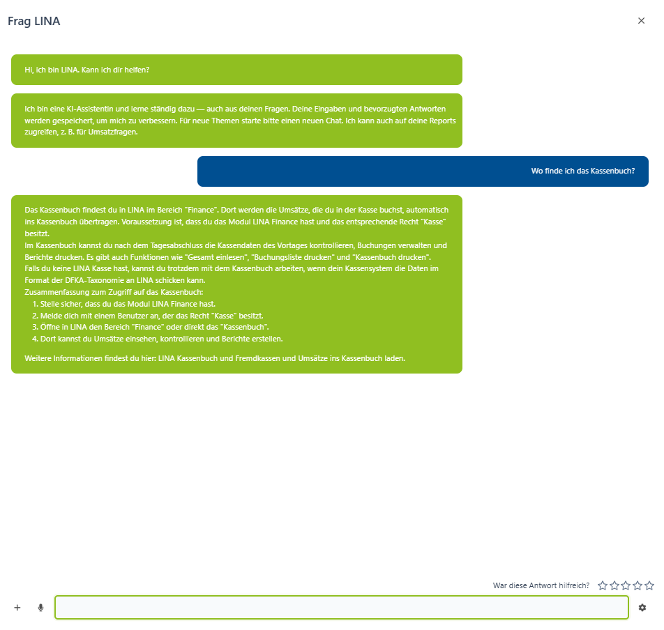 Nachdem du die Antwort auf deine Frage erhalten hast kannst du anhand der 5 Sterne bei "War diese Antwort hilfreich?" diese bewerten. Anhand dieser kann Lina dazu lernen ob das der passenden Handbuchartikel für die Frage war oder ein anderer besser geeignet gewesen wäre.
