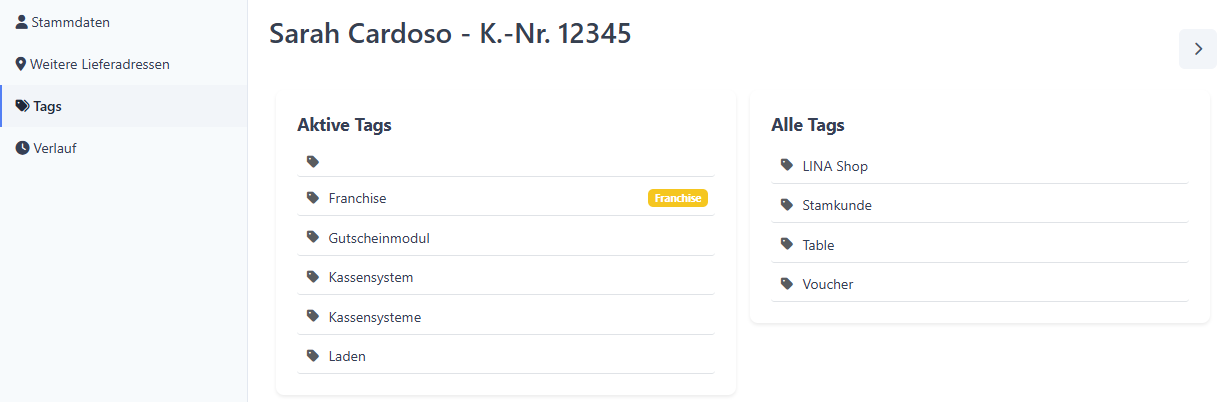 Unter dem Reiter Tags kannst du festlegen, welche Newsletter an deinen Kunden versendet werden, beziehungsweise zu welcher Newsletter-Gruppe er gehört. Um dem Kunden einen Tag zuzuordnen klickst du einfach unter Alle Tags auf den gewünschten drauf. Dieser wird dann links unter Aktive Tags angezeigt. Möchtest du Tags entfernen so klickst du wieder darauf und sie werden nach rechts zu Alle Tags hinzugefügt.