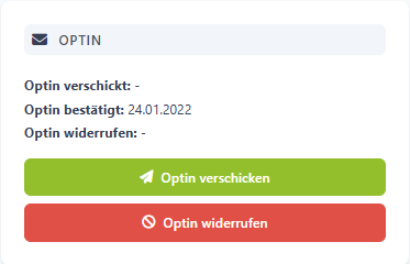 Du hast hier drei Optionen für den OptIn. Anhand von Optin verschicken kannst du die Einladung zu deinem Newsletter versenden. Du kannst den OptIn entweder manuell Verschicken, Bestätigen und Widerrufen oder dieses Feld wird ausgefüllt, wenn der Kunde in deinem System die entsprechende Aktion ausführt.