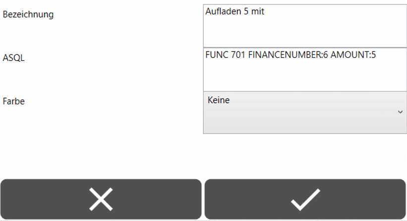 Du hast auch die Möglichkeit den Button ohne direkte Auswahl des Finanzweges anzulegen, in dem Fall lässt du einfach Financenumber weg. In dem Fall wird beim Verkaufen und Bezahlen, zunächst der Finanzweg abgefragt.