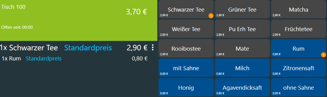 | Punkt 10 | Die Tender werden hier in Dunkelblau dargestellt. Bucht man den Schwarzen Tee und tippt direkt danach auf Rum, wird der Rum als Tender an den Hauptartikel mit angehängt. Der Tender hängt sich immer an den zuletzt gebuchten Artikel.![]() |