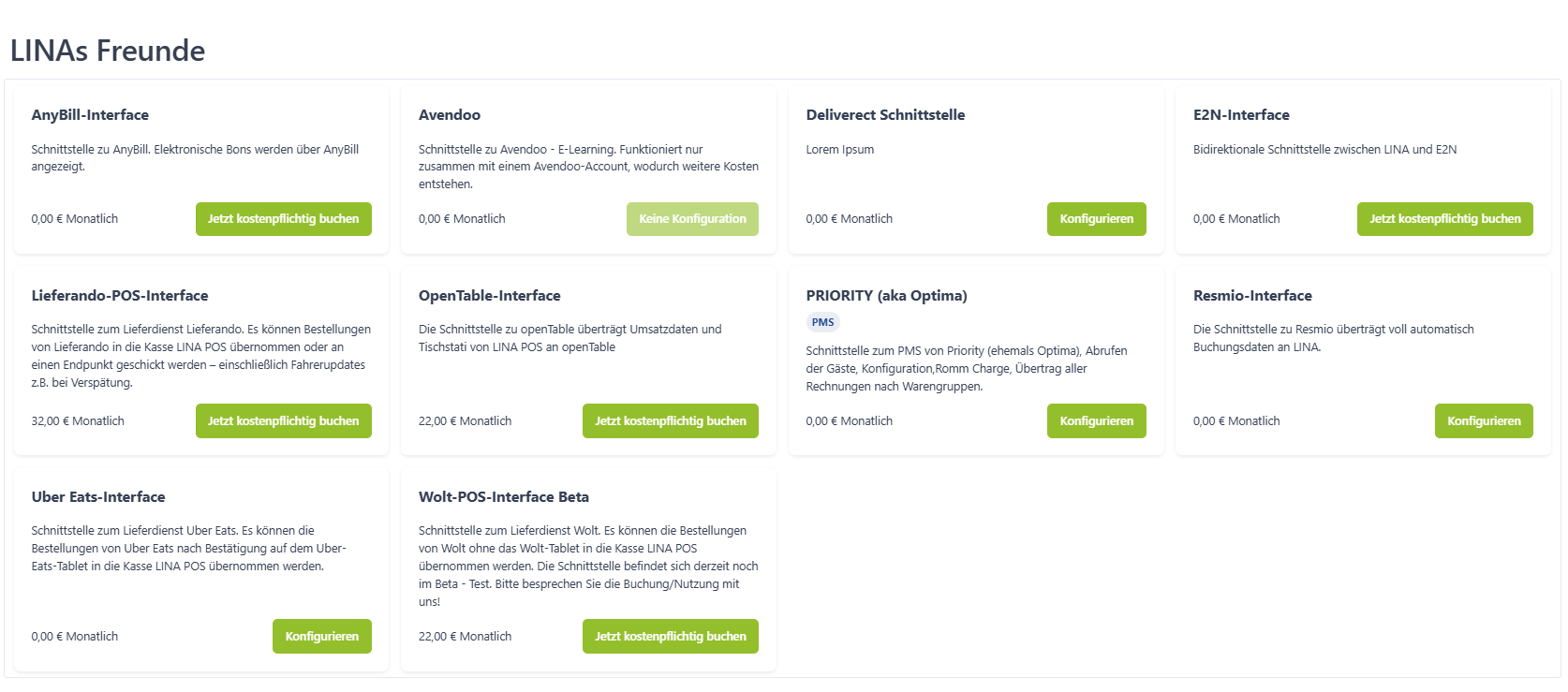 Unter LINAs Freunde kannst du alle Module, welche Schnittstellen beinhalten, sowohl buchen als auch konfigurieren.