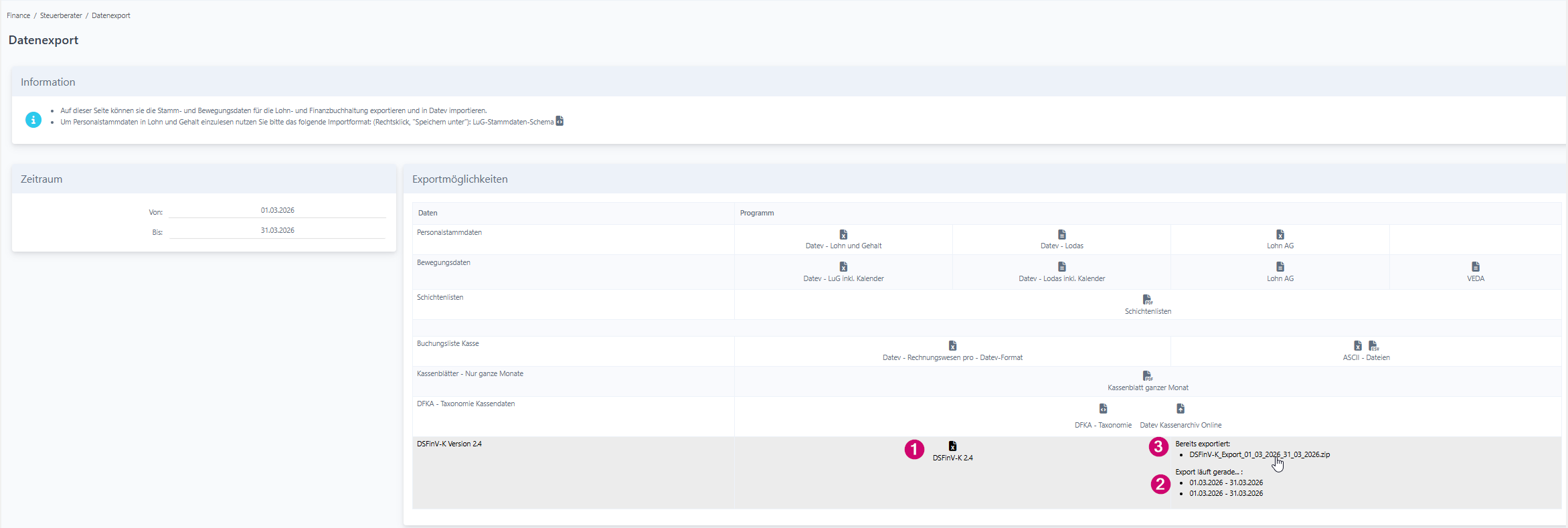 Sprich hierzu mit deinem Steuerberater um zu erfahren welche Exporte du benötigst. Dies kann bei einer Kassenprüfung oder Kündigung unterschiedlich sein.
