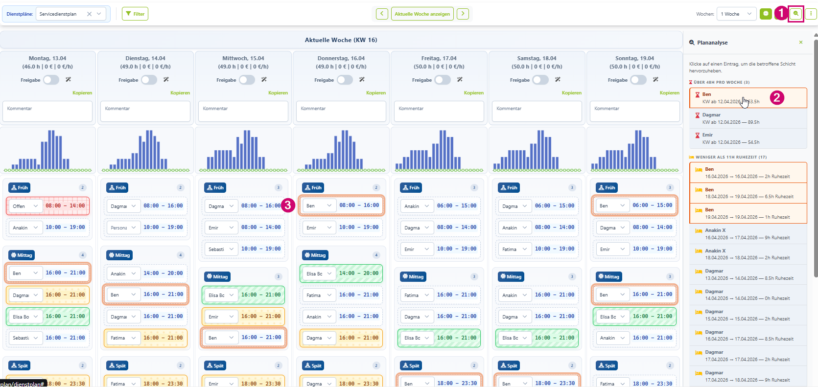 Die Planungsanalyse (1) in LINA hilft dir dabei die geplanten Schichten der Mitarbeiter im Blick zu behalten.