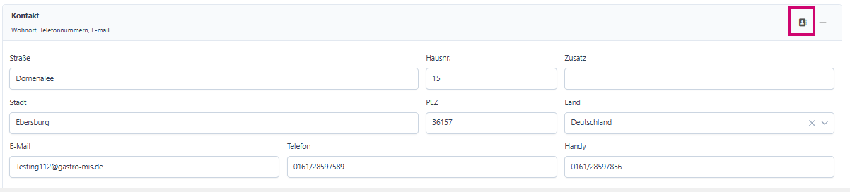 Hier hinterlegst du die Kontaktinformationen deines Mitarbeiters, über das Adressbuchicon kannst du die Kontaktinformationen nach Outlook exportieren.