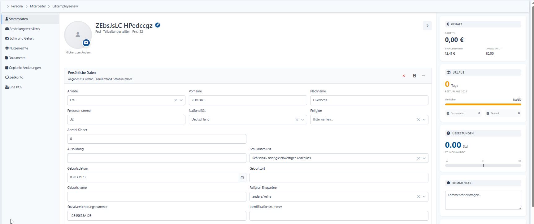 Um die Stammdaten des Mitarbeiters zu sehen, wechsele bitte im System zu: