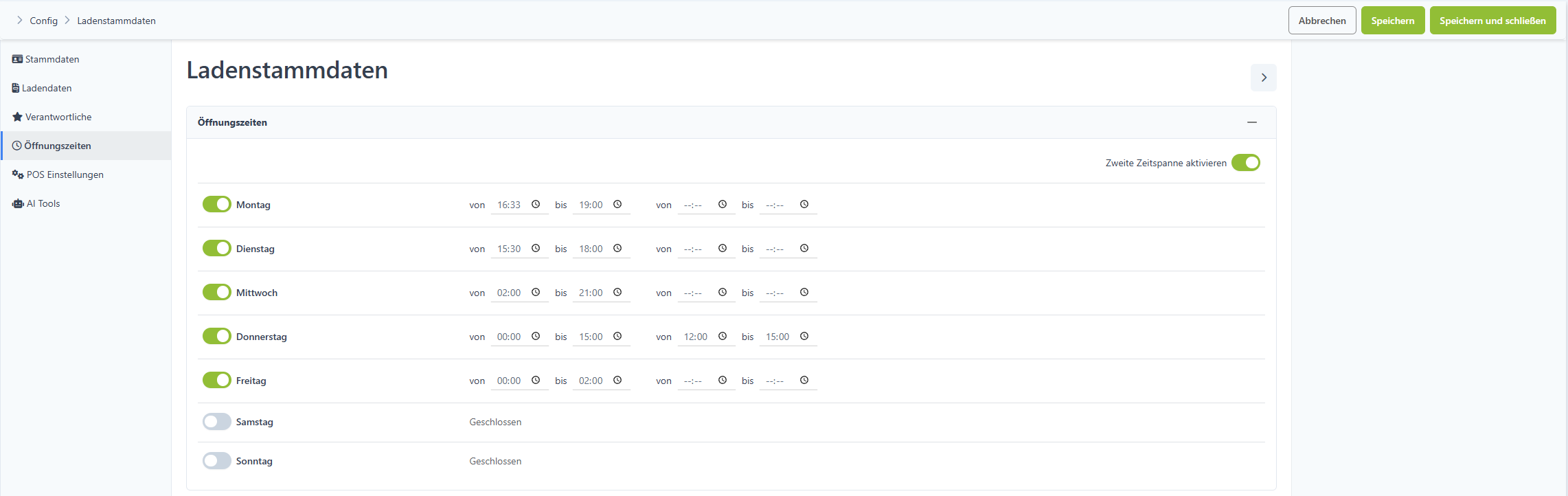 Mit den Schiebebuttons neben den Wochentagen, legst du fest, welcher Tag geöffnet sein soll. Deaktivierst du den Schiebebutton, so wird dieser Tag als geschlossen gekennzeichnet.