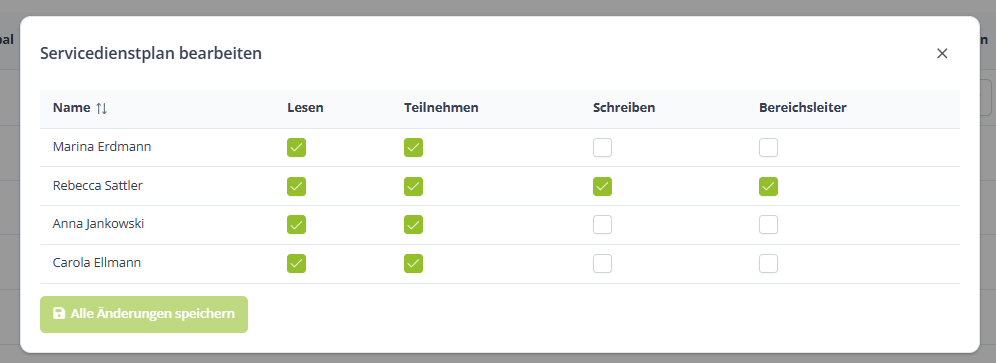 Nun klicken wir rechts auf das Männchen bei Erweiterte Einstellungen und definieren, wer alles im Dienstplan eingeteilt werden darf, wer ihn lesen darf und wer ihn schreiben darf: