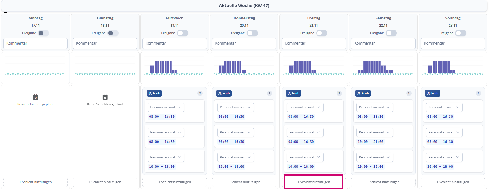 Klicke also hier drauf um eine Schicht hinzuzufügen, ihr eine für den Tag individuelle Zeit zu geben und die Person die die Schicht übernehmen soll, bereits zuzuordnen: