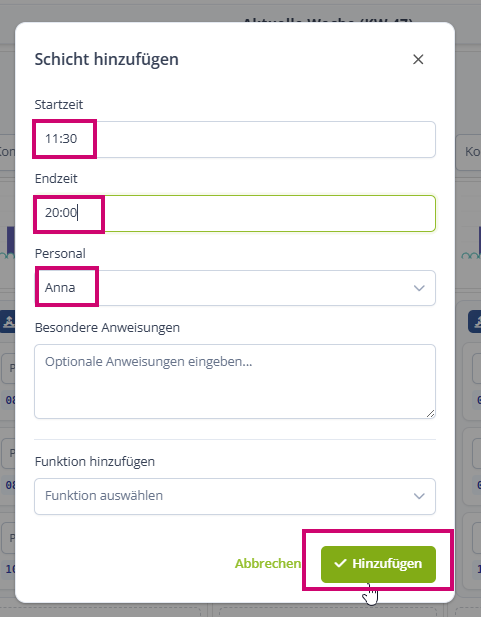 Du kannst aber auch eine Schicht hinzufügen, ohne eine Person bereits auszuwählen: