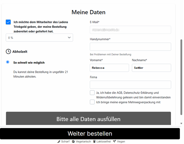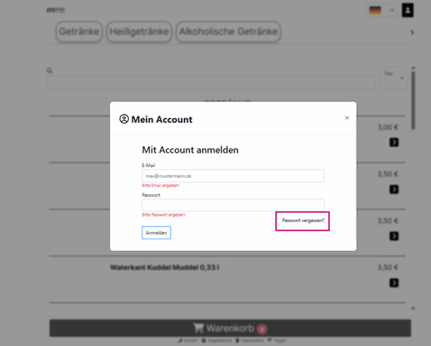 Wichtig: Die Mailadresse muss mit der Mailadresse übereinstimmen, die für den Mitarbeiter durch den Verantwortlichen an den Gastronomen übermittelt wurde. Diese ist mit dem vereinbarten Kost-Sachbezug verknüpft: