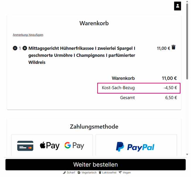 Im Warenkorb wird ihm der Kost-Sachbezug bereits angezeigt: