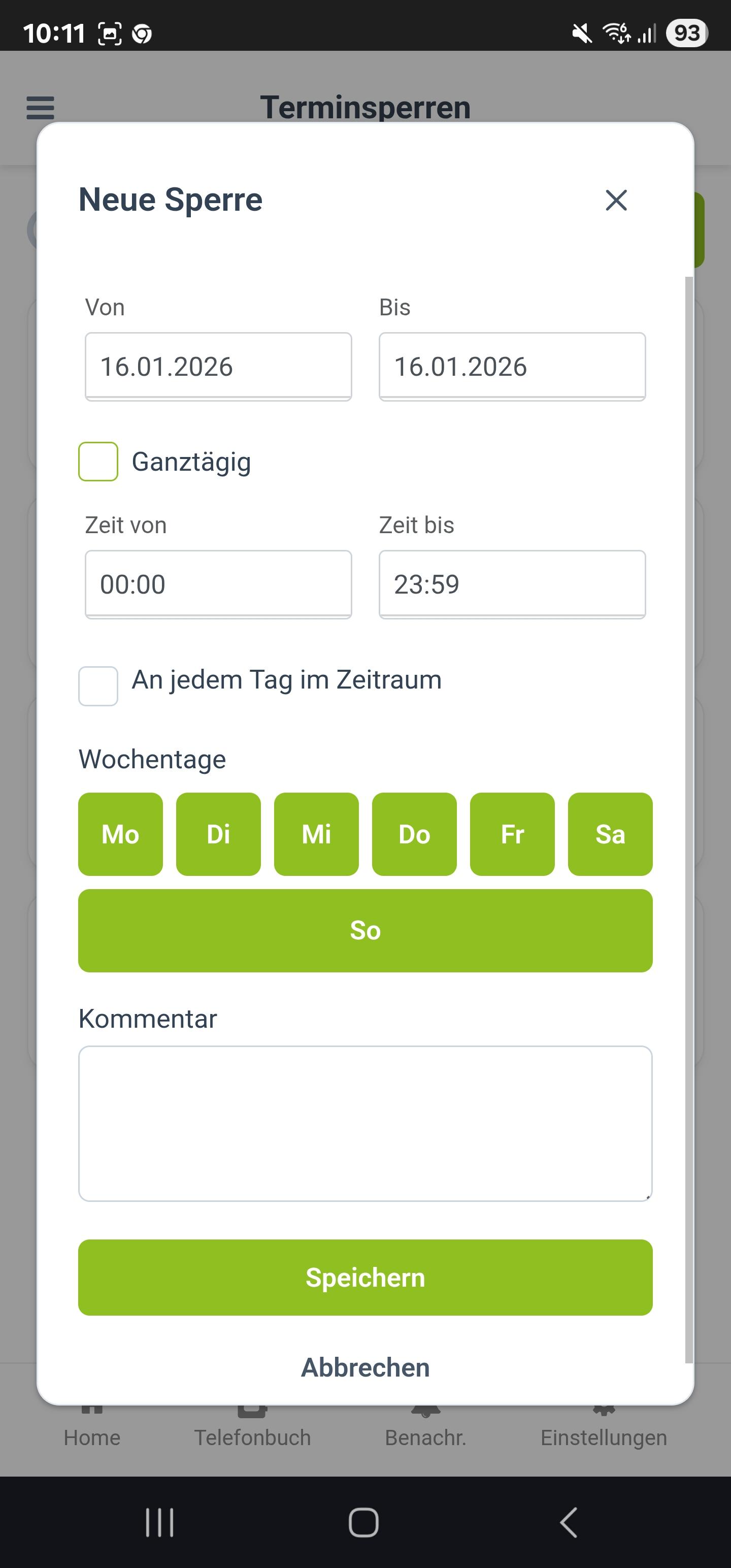 Über den Button "+Neue Sperre" kannst du eine neue Terminsperre anlegen.