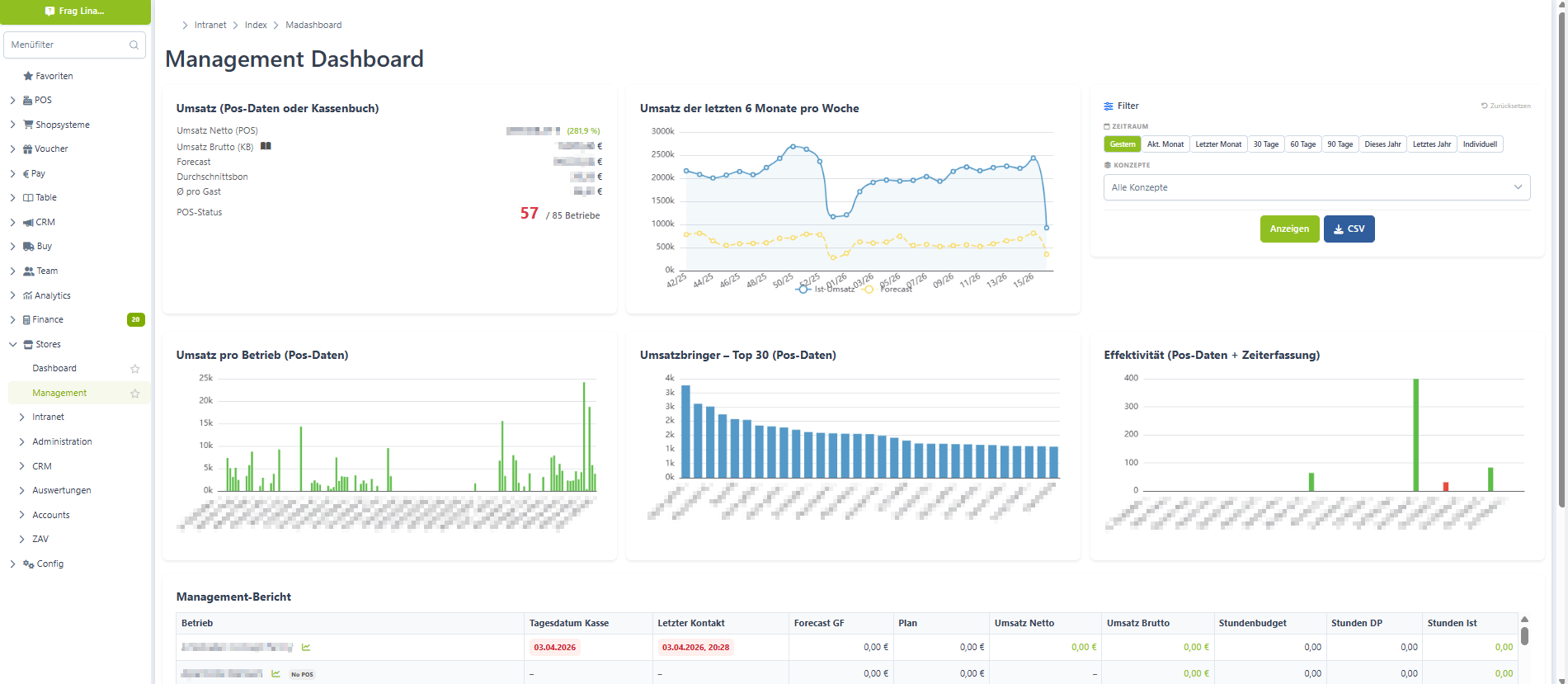 Statt mühsam Berichte aus einzelnen Läden abzufragen, liefert dir das Dashboard den direkten Vergleich. Du erkennst sofort, welche Betriebe über dem Forecast liegen, wo der Durchschnittsbon glänzt und an welchen Stellen du steuernd eingreifen musst. So triffst du Entscheidungen nicht mehr aus dem Bauch heraus, sondern auf Basis knallharter Fakten.