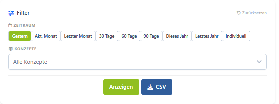 Oben rechts kannst du unter "Filter" bestimmen, welcher Zeitraum und welches Konzept (solltest du verschiedene Konzepte für deine Franchise haben) angezeigt werden soll.
