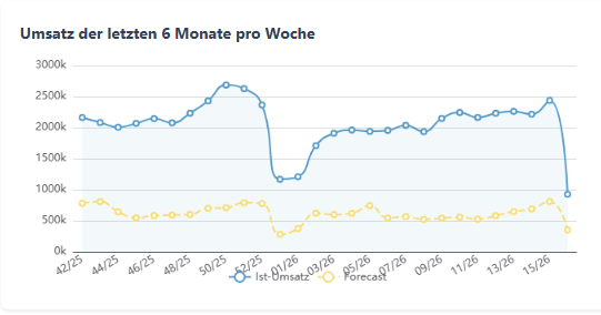 Zeigt den Umsatz der letzten 6 Monate pro Woche, aller Franchise-Betriebe an. Diese Anzeige wird nicht vom eingestellten Zeitraum unter "Filter" beeinflusst.