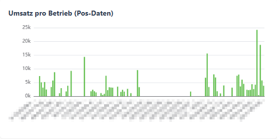 Zeigt den Umsatz laut Kassendaten für alle Franchise Betriebe, die eine Kassenanbindung haben. Mit einem Mouseover über die grünen Statistikbalken kannst du den Wert für diesen Betrieb einsehen.