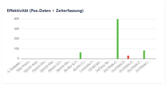 Mit einem Mouseover über über die grünen, gelben oder roten Balken siehst du welche Effektivität der Betrieb für den eingestellten Zeitraum erreicht hat. Anhand der Farbe also grün, gelb oder rot, erkennst du wie gut die erreichte Effektivität ist.